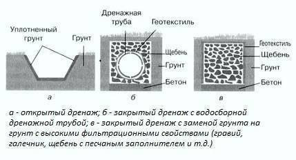 - засыпная – принцип ее построения такой же, как и глубинной, только используется исключительно дренажный материал без труб; подходит для осушения участков при выпадении осадков.