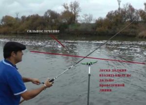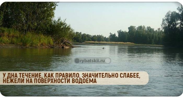 Это верно лишь, когда в точке входа лески в воду сила течения существенно не отличается, от силы течения возле берега. А вот если мы ловим на русле, где течение более сильное, тогда наша леска должна входить в воду намного раньше, поскольку максимальная скорость течения у нас как раз возле поверхности, а вот чем дальше в глубину, тем оно слабее.