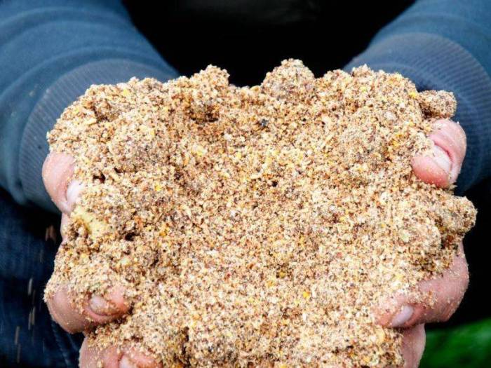 За основу берётся килограмм жмыха подсолнечника, добавляется такое же количество варёного пшена. Отрубей ржаных понадобится тоже килограмм. Кормового мотеля добавляется приблизительно три спичечных коробка. Чтобы смесь хорошо пахла, добавляем две чайные ложки кориандра. Для скрепления состава добавляем песка или глины.