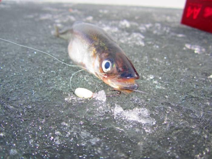 После поимка первой корюшки нарезаю её на кусочки и насаживаю на две – три мормышки, взамен карасёвой резки. Наблюдаю за клёвом, веду в голове статистику, далее исходя из предпочтений рыбы на текущий момент меняю снасти и насадку – и смотрю на результат.