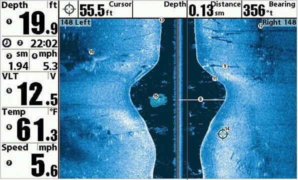 Цифрами на рисунке обозначены: 1 — Глубина под лодкой 2 — Время в пути по GPS приемнику 3 — Пройденное расстояние по GPS приемнику 4 — Средняя скорость 5 — Напряжение источника питания 6 — Температура воды 7 — Скорость по GPS приемнику 8 — Толща воды 9 — Тени 10 — Изменения рельефа 11 — Отражение от дна 12 — Боковое изображение 13 — Верх дисплея 14 — Курсор 15 — Белые полоски могут быть рыбой Назначение сонара Side Imaging – за короткое время просмотреть большую акваторию, обнаружить подводные структуры в которых стоит рыба и отметить их, чтобы вернуться позднее. Этот сонар за один проход катера просматривает полосу шириной 160 метров и сильно упрощает работу по изучению водоема. Он работает на частоте 455 кГц и распознает объекты на глубине до 30 метров.