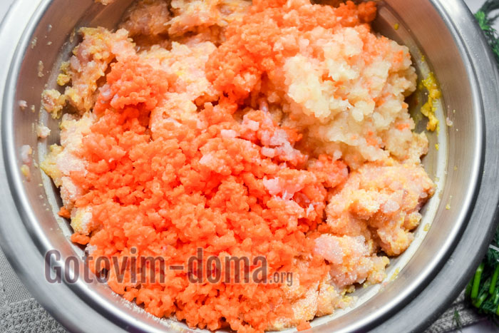 - Необходимо очистить овощи и измельчить их. Морковь лучше натереть на мелкой терке. Лук можно порезать полукольцами или мельче. Для детского меню овощи можно измельчать в мясорубке.