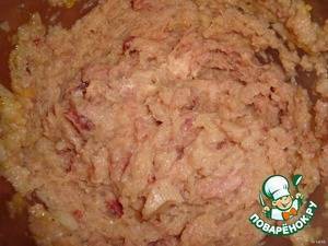 - Лук и чеснок измельчают и добавляют к филе. К массе добавляют размоченный хлеб, после чего ее солят и перчат. В смесь вливают взбитое яйцо.