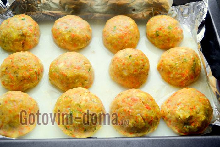 - Из готового фарша сформируйте тефтели и выложите их в форму для запекания, предварительно смазанную маслом.