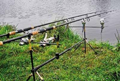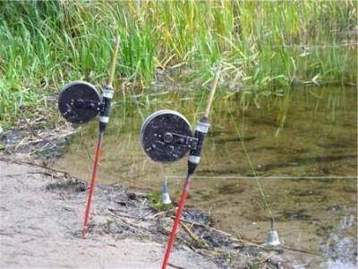 Расстановка удочек. На этом этапе кроме кормушек, прикреплённых к снасти, на крючки цепляют наживку. Она должна быть достаточно крупной и более привлекательной, чем приманка. Когда оснастка помещается на дно, удилище нужно установить на подставку. Также обязательно на катушке включают байтранер или фрикционный тормоз, чтобы снасть не уплыла в реку вместе с сазаном в случае, если он начнёт тянуть леску очень сильно и резко, а вы не успеете его остановить.