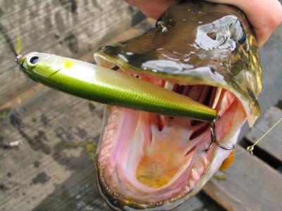 Щука, обитающая на относительном мелководье, хотя также достигает внушительных размеров, ведет себя несколько иначе. Засады устраивает на бровке русла, на свалах в глубину, за перекатами, за всякой притопленной коряжиной или кустом. Более подвижная, охотно и упорно гонится за приманкой, частенько промахивается, засекается за голову или туловище и бурно сопротивляется: ходит кругами, выскакивает из воды, разевает пасть и трясет головой. Частенько ей таки удается освободиться от приманки. У меня наблюдались сходы при ловле на поппер при трех тройниках.