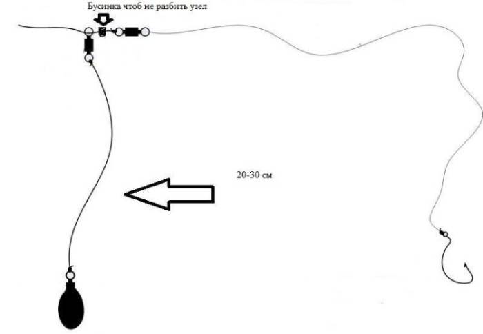 Монтаж выглядит просто: на основную леску заводят кормушку, далее устанавливают скользящую бусину и вертлюг. Бусина не дает грузу разбивать узел, поэтому ее наличие обязательно. От вертлюга отходит полуметровый поводок с крючком.