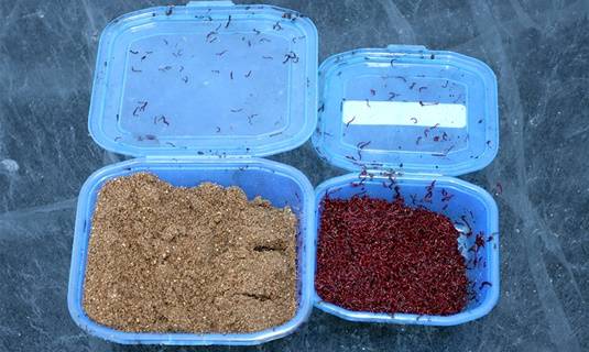 Я бы ещё посоветовал не воздух там оставить, а дырочки в крышке сделать. Не только мальки-то будут видны, но и запах пойдёт! Можно бросать мотыля (если не жалко или взять кормовой) или кусочки рыбы прямо в лунку – это самое простое. Также червей рубят.
