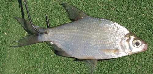 Живца насаживали следующим способом: зажимали его животом кверху, головой к себе или от себя, кому как удобней, заводили конец поводка в рот рыбе (фото 27) и, проталкивая по пищеводу, выводили конец поводка в анальное отверстие живца (фото 28). Соответственно, выведенную петельку цепляли к снасти, а крючки заводили в рот рыбке (фото 29 и 30).