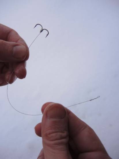К концу лески крепится металлический поводок, с одинарным (можно двойным и тройным) крючком. Естественно, что поводок оказывает значительное влияние на характеристики снасти, но при ловле щуки он просто необходим. Крепление осуществляется с помощью карабина, хотя возможны и другие варианты.