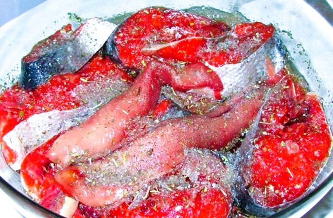 Рыбу порезать кусочками, разморозить, если она была заморожена. Теперь готовим маринад, он получается вкусный, сбалансированный, проверенный годами.