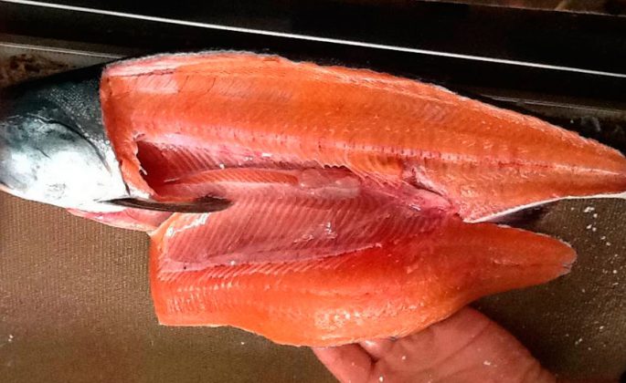 Тушка нерки разделывается, чтобы осталось одно мясо, без кожи и костей.
