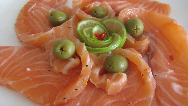 - Слейте рассол. Филе нерки нарежьте тонкими ломтиками, разложите на блюде.