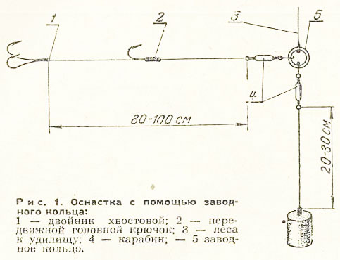 Верхнему крючку (желательно с подогнутым колечком) придается подвижность: его приматывают к поводку ниткой в два ряда на расстоянии б-10 см от нижнего якорька и, передвигая выше или ниже, устанавливают по размеру живца (рис. 1).