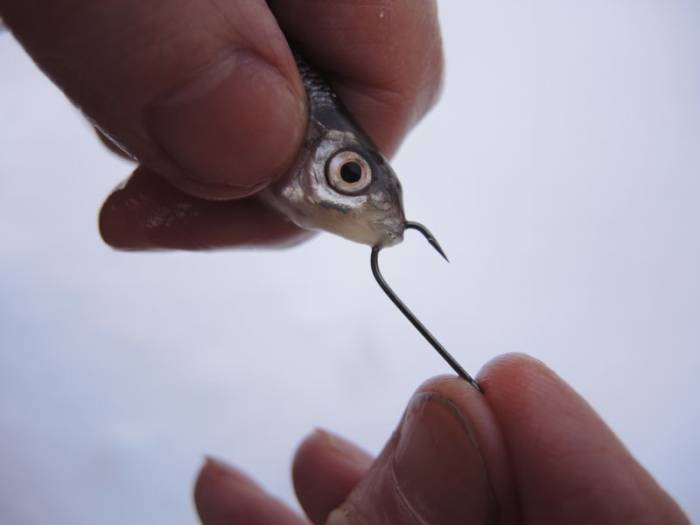 - Сначала нужно продеть крючок сквозь нижнюю губу живца, а потом сквозь верхнюю.
