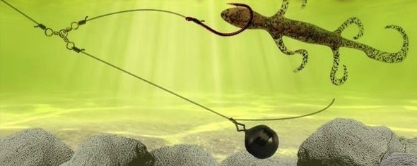 Возможен и такой способ оснастки, когда поводок с грузилом на конце свободно перемещается по основной леске благодаря использованию вертлюга