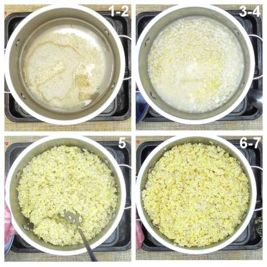 - Засыпать в кастрюлю пшено, размешать и продолжить варить под крышкой. Когда воды сверху почти не останется и пшено начнёт развариваться, нужно выключить огонь и накрыть ёмкость.