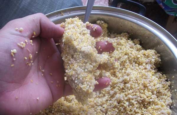 При соблюдении пропорций каша получается рыхловатой, но при сдавливании комка смеси в руке, он должен хорошо лепиться, а после небольшого нажатия разрушаться.