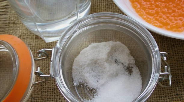 Два стакана воды подогреть до температуры около 50 градусов. Всыпать чайную ложку соли.
