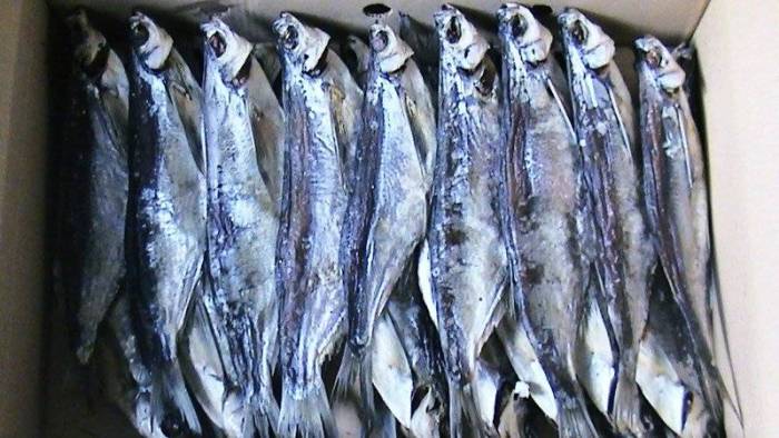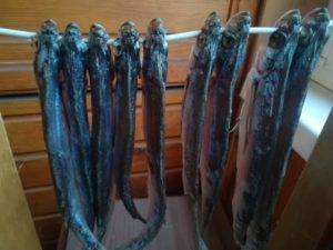 - Рыба должна стать слегка твердой. Затем все это промываем холодной водой и вывешиваем просушиваться так, чтобы рыбки не соприкасались.