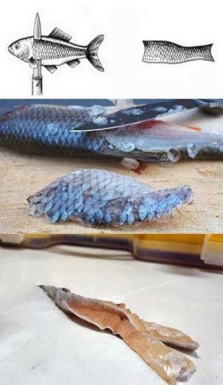 Для изготовления насадки используют карповые породы рыб, разделяя их филейную часть на небольшие полоски длиной 8–12 см и шириной 2–3 см. Эта натуральная наживка имеет несколько преимуществ: