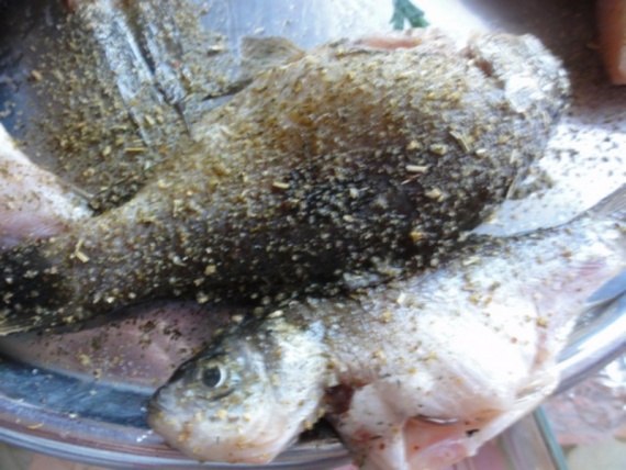 - Караси моем, потрошим, чистим. Обсушиваем бумажным полотенцем. Вдоль хребта делаем надрезы. Помещаем рыбу в чашу, заливаем кунжутно-масляной заправкой и отправляем в прохладное место на 60 минут.
