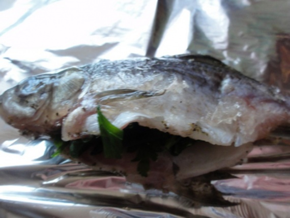 - Лучше всего класть рыбу не на смазанный маслом противень, а на подложку из овощей или же слой фольги.