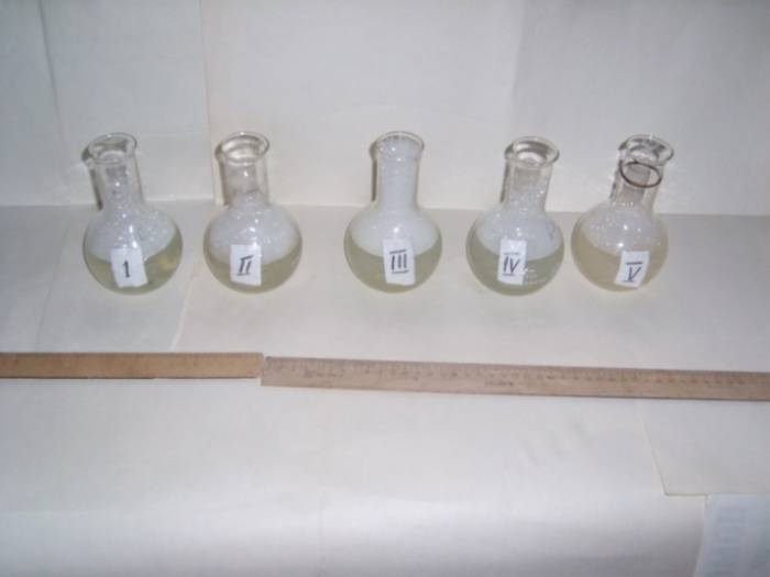 необходимо приготовить и измельчить 1 г мыла (для этого потребуются точные весы). Поместите стиральный порошок в стакан, добавьте теплую, но не кипящую дистиллированную воду и тщательно перемешайте до полного растворения мыла. Если мыла 60%, то нужно доливать дистиллированную воду на высоту 6 см, если 72%, то соответственно до 7,2 см (можно около 7 см).