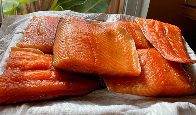 Продолжительность копчения зависит от размера продукта. Стейки или филе среднего размера коптятся около 17-20 часов, целые тушки лосося – до 48 часов.