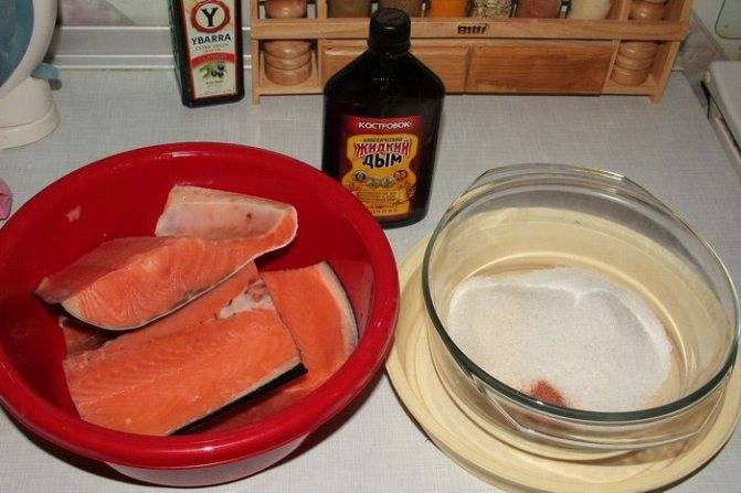 Для копчения желательно отбирать не замороженную, а свежую рыбу. Такое изделие можно распознать по нежно-розовому оттенку мякоти. Можно брать рыбу целиком. Также используются стейки или хребет сёмги, по желанию.