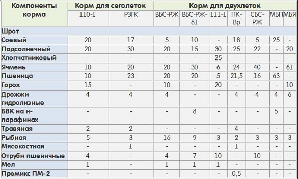Большое содержание белка в этих кормах (30%) позволяет выращивать крепких и здоровых сеголетков, способных хорошо переносить зимовку.Комбикорма СБС-РЖ, ПК-Вр и Ш-1 предназначены для кормления товарных двухлетков в течение всего сезона (табл. 5).Начало кормления годовиков и старших возрастных групп определяется температурой воды и состоянием естественной кормовой базы. Начинать кормить необходимо при температуре 15-18 °С. В первые дни количество корма должно быть не более 1% массы рыб. По мере привыкания рыбы к корму и повышения температуры воды количество корма следует довести до нормы.Таблица 5 – Состав комбикормов для выращивания товарных двухлетков карпа в прудах, %