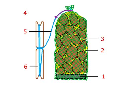 По периметру прикормки между ячейками сетки и кашей вплотную друг к другу выкладываются тонкие кусочки сухарей из ржаного хлеба (3), препятствующие быстрому вымыванию прикормки.