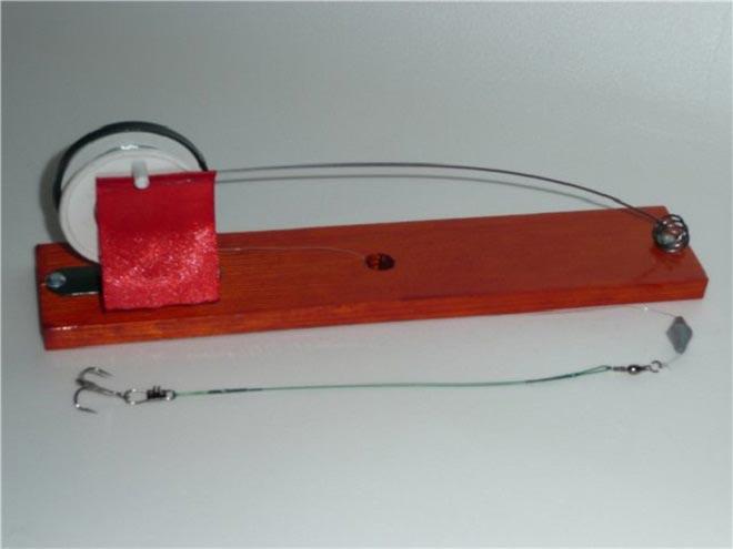 Простейшая самодельная жерлица для зимней рыбалки, которую до сих пор можно увидеть иногда на водоеме. Оснастка и флажок крепится на деревянной плашке, которая кладется над лункой. Вариантов плашки несколько: