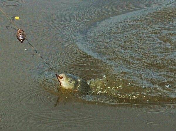 - Подождите 10 секунд, чтобы корм немного размок и сделайте хлесткую подсечку, корм должен моментально вымыться в точке ловли, а кормушку можно вытаскивать. Стартовое закармливание делают не менее 10-15 забросов, после чего прикрепляют поводок с крючком и начинают активную ловлю.