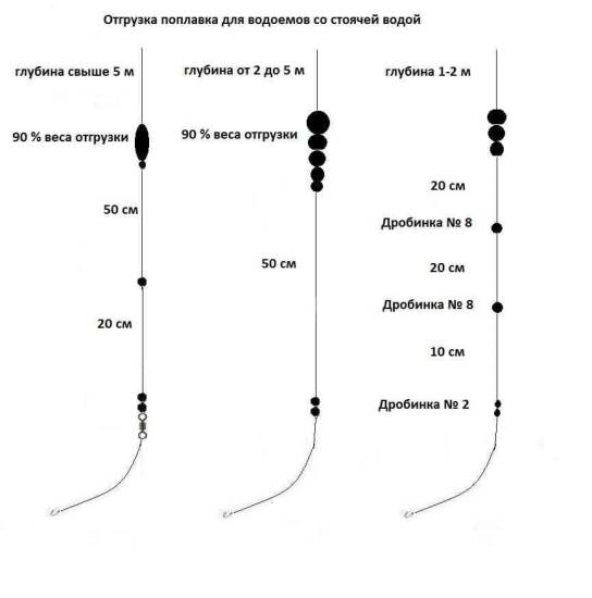- Маховая удочка. Основная огрузка — крепится в 20 сантиметрах над промежуточным грузом. Составляет 60% от всего веса груза. Промежуточный груз — используется одна дробина, крепится на 15 сантиметрах от подпаска. Подпасок — небольшое количество дробинок, крепится у петли поводка и лески. Вес — 0,2 грамма