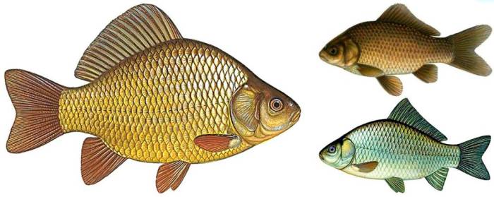 Золотая рыбка представлена серебристыми, оранжево-золотистыми подвидами. Есть представители с чешуей, окрашенный в легкий медный оттенок.