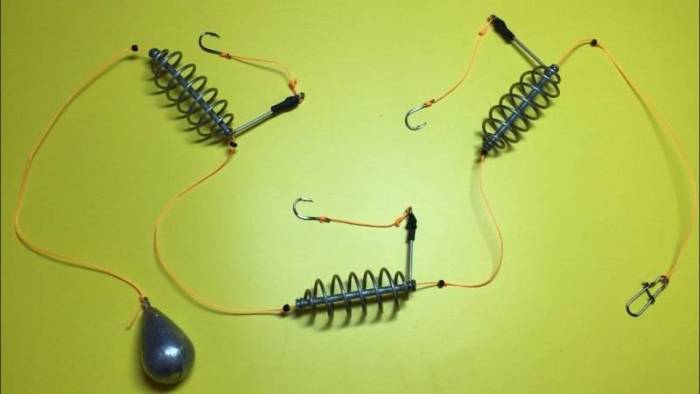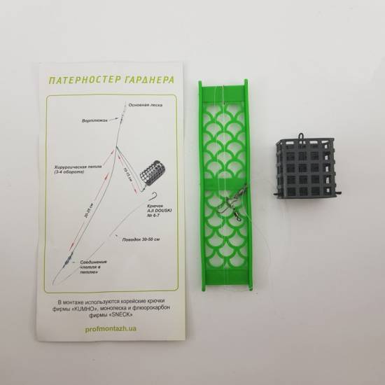 Состоит из кормушки с грузиком и трёх коромыслиц с поводками. С одной стороны удобно: поводки не закручиваются и три насадки можно наживить