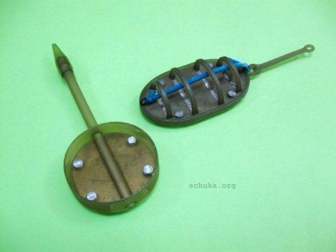 Кормушки для судака должны быть легкими, весом около 15-20 г, обычно спиралевидной формы. После наживки рыбы, особенно при ловле карася с близкого расстояния, можно сменить кормушку на легкое свинцовое грузило.