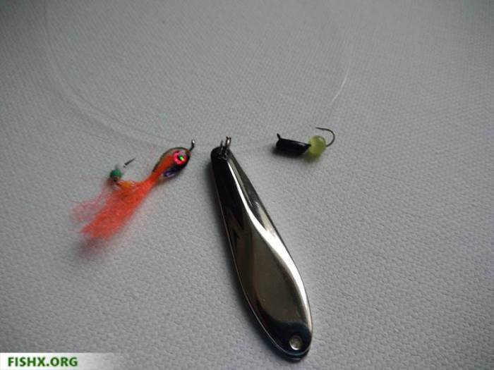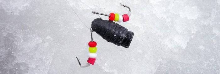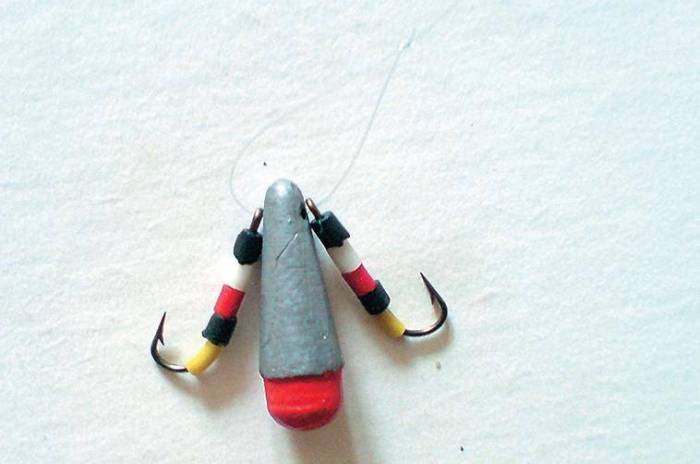 - 2 одинаковых крючка, размещенные по бокам грузила на леске, для этого связывают петлю;