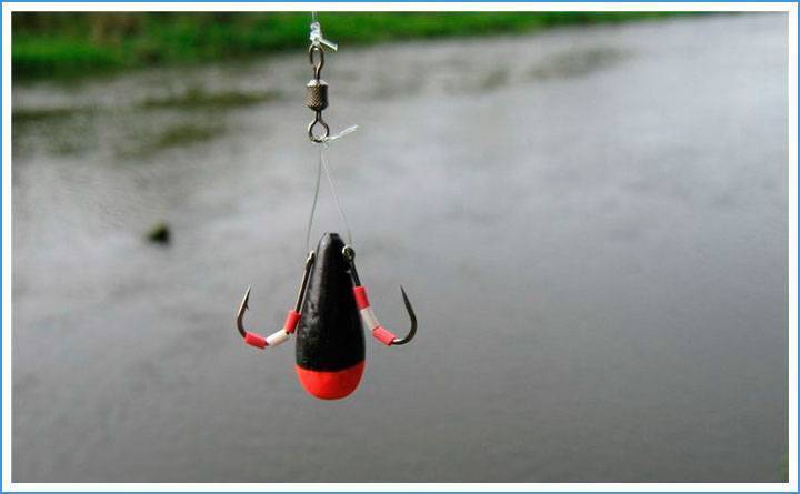 - грузило с двумя одинарными крючками в петле на конце основной лески. Груз, ударяясь о дно, поднимает облачко мути. Крючки продолжают шевелиться после остановки груза, тем самым вызывая поклевку рыбы;
