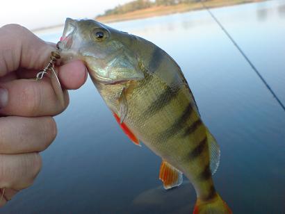 Где-то в конце августа, начале сентября начинается период осеннего лова окуня на спиннинг. В этот период окунь начинает клевать более активно, что объясняется наступлением холодов. Крупный окунь перемещается на глубину, а более мелкий, еще не против погреться под лучами солнца. Осенью лучше всего ловить окуня в теплый солнечный день при наличии слабого южного ветерка. В это время предпочтение следует отдать силиконовым приманкам в виде рыбок или твистеров, длиной от 2,5 до 5см. Качество этих приманок и будет решающим в ловле окуня. Хвостики рыбок и твистеров должны правдоподобно играть при любых скоростях подмотки, в том числе и минимальных. В большинстве случаев пользуются ступенчатой проводкой, поскольку рыбачить приходится на глубине, в поисках более крупного окуня. На участках, где находится более мелкий окунь, применяются мелкие воблеры, вертушки, колебалки или силиконки.