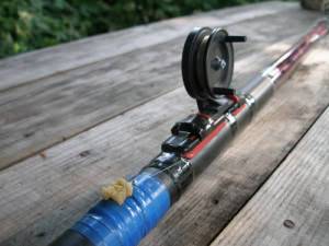 - Удилище — жесткое спиннинговое, с тестом 80-100 г быстрого строя длиной до 3 м, либо карповое — длиной в 5-6 м. Для лова с лодки оно немного короче.