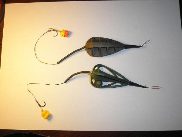Такие крепления производятся на двух отводах. К наиболее длинному из них прикрепляют поводок, за короткий цепляют кормушку. Установка таких оснасток позволяет одновременно использовать леску различного диаметра, причем стоит отметить, что наиболее толстую леску закрепляют на поводке. Это делают для того, чтобы при зацеплении кормушки при вываживании улова, можно было сохранить рыбу.