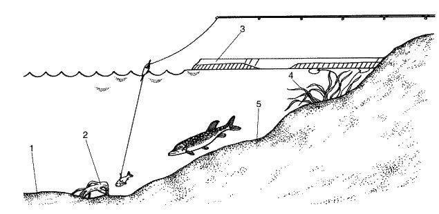 Участки среди коряг и примыкания акваторий к валежнику также относятся к местам стоянки зубатой. В таких условиях на живца с лодки ловить гораздо удобней. Ведь точность постановки монтажа серьёзно влияет на количество поклёвок, а с берега ювелирный заброс в стеснённую препятствиями точку лова выполнить не всегда представляется возможным. Ловля спиннингом на живца по большей мере осуществляется на границах с перекатами, с проводкой наживки с отмели в глубину.