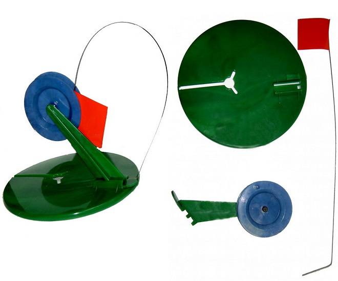 - Магазинные или самодельные флажки с катушкой и экраном для лунки (от замерзания) – самый рациональный вариант, удобный и надежный.