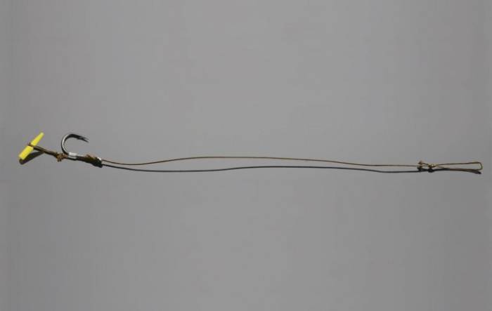 В этом варианте патерностера поводок крепится к отводу не из лески, а из проволоки. Если она будет достаточно жесткой, при ловле с таким монтажом хорошо, лучше, чем с обычным патерностером, заметны поклевки при потяжках как к берегу, так и от берега.