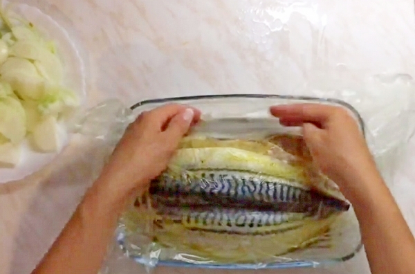 4. Рыбу в маринаде и луке накрываем пищевой пленкой и ставим в холодильник на время от 1 до 10 часов.
