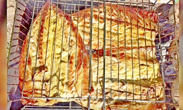 Приготовление на мангале в специальной решетке простое. Рыбина нарезается на кусочки и обтирается специями. Лаврушка ломается на мелкие части и обсыпается вся поверхность. Затем заготовка пакуется в целован и кладется в холодильник на всю ночь.