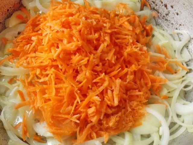 Пассеруем лук до мягкости и добавляем тёртую морковку