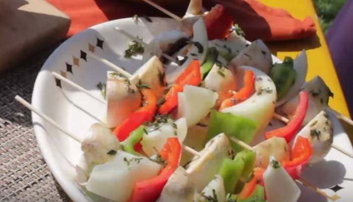 6. Подавать к столу с пылу-жару прямо на шампурчиках, украсив блюдо овощной нарезкой, различными соусами или свежей зеленью.